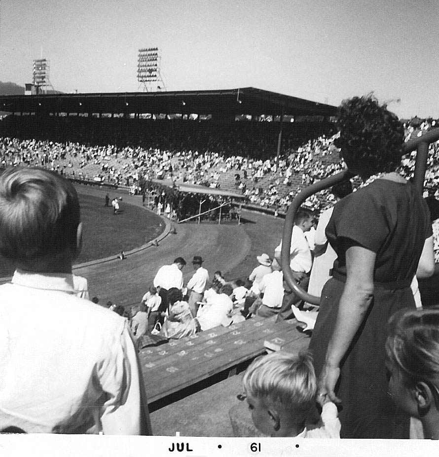 It was still the early afternoon and the program was not going to start until later in the day. The young couple had dropped me off at the main entrance of the Stadium, and now, standing just inside under the bleachers with my back towards one pillar